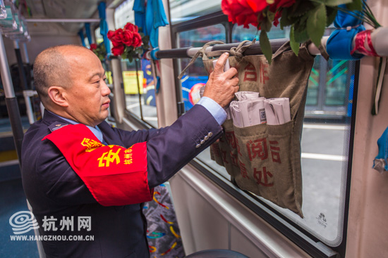 孔師傅整理車上免費借閱的報紙