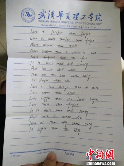 該男生名叫周鶴齡,為了寫好這34份書信,他上網(wǎng)查找大量資料,還在圖書館翻閱書籍,花了3天時(shí)間完工。他說:“我在參考英文詩(shī)歌的基礎(chǔ)上再原創(chuàng),盡量嘗試用不同的方式去表達(dá),希望每一封信都能準(zhǔn)確地傳達(dá)出我的想法”。每封信件用信封裝著,英文字體清秀,字里行間流露出周鶴齡對(duì)女同學(xué)們的祝愿、祝福。