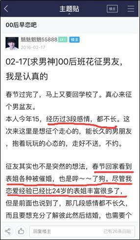 百度貼吧里的“00后早戀吧”里已經(jīng)有了兩千多萬(wàn)的帖子,去年還有一位00后曾貼出“征婚帖”: