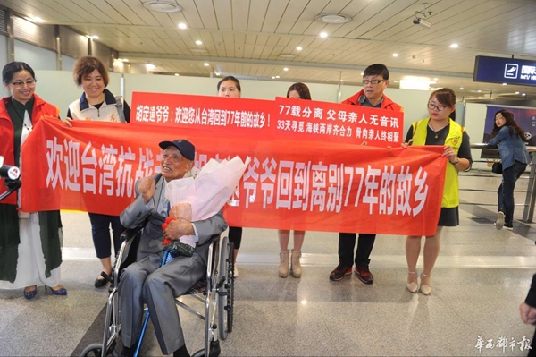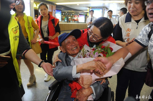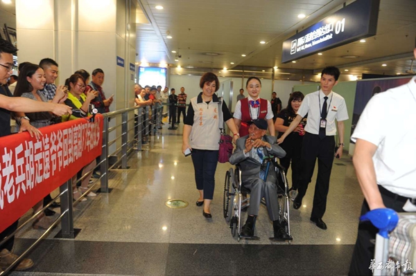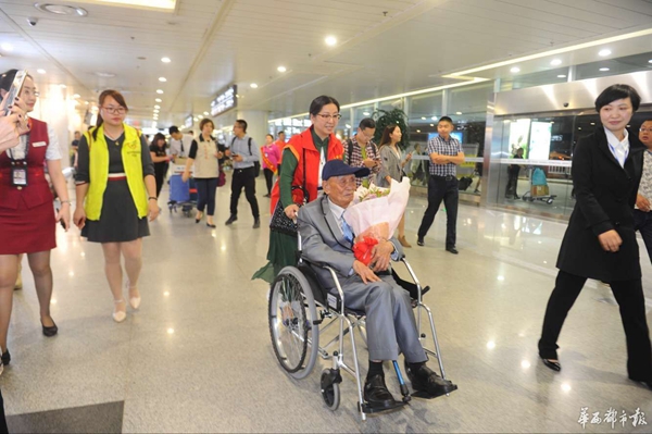 當(dāng)晚9點(diǎn)45分左右,胡定遠(yuǎn)坐在機(jī)場(chǎng)提供的輪椅上,出現(xiàn)在了眾人的視野里。面對(duì)前來(lái)迎接的志愿者,胡老微笑著,點(diǎn)頭、揮手以示回應(yīng),還用地道的瀘州話不斷說(shuō)著“謝謝”。同時(shí),他的目光始終在打量周圍的景象,70余年時(shí)光飛逝,這里的景象早非當(dāng)年!肮烙(jì)老家沒(méi)人認(rèn)識(shí)我了!焙陷p嘆。