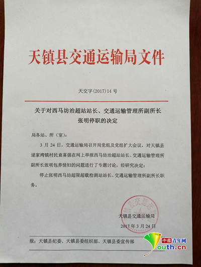 3月24日天鎮(zhèn)縣交通運輸局發(fā)布《關(guān)于對西馬坊治超站站長、交通運輸管理所副所長張明停職的決定》文件指出,3月24日,交通運輸局召開黨組及黨組擴大會議,對天鎮(zhèn)縣逯家灣村民袁某強在網(wǎng)上舉報西馬坊治超站站長、交通運輸管理所副所長張明包養(yǎng)情婦的問題進(jìn)行了專題討論,經(jīng)研究決定:停止張明西馬坊超限超載檢測站站長、交通運輸管理所副所長職務(wù)。