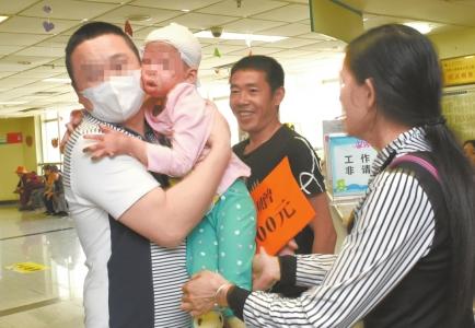 幾分鐘后,豪豪的父親鄧先生從病房走出來,在眾多熱心人士見證下,接過徐榮富送上的3萬元善款,兩個父親相擁在一起,“謝謝!你們一家也要加油!编囅壬f。
