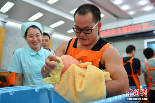 資料圖:2015年9月13日,湖南省兒童醫(yī)院開設(shè)的“超級奶爸”公益訓(xùn)練營開營。 李奇 攝