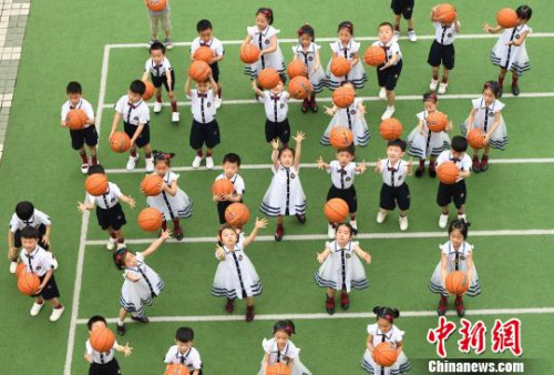 資料圖:幼兒園小朋友進(jìn)行花樣拍籃球彩排演練 卓忠偉 攝