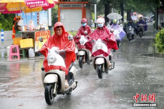 6月16日,廣西柳州市遭暴雨侵襲,民眾穿著雨衣騎電動(dòng)車(chē)出行。 中新社記者 朱柳融 攝