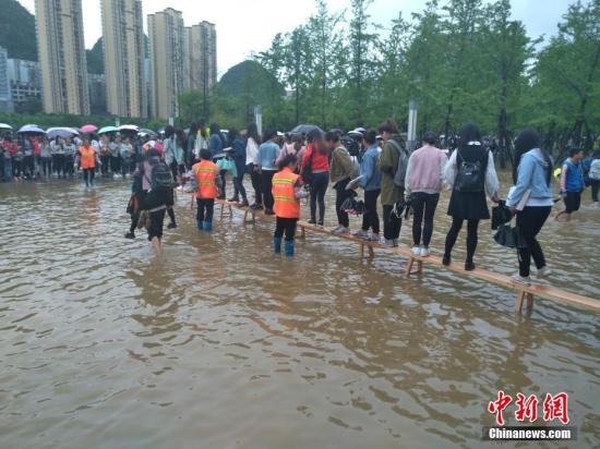 6月15日,受強(qiáng)降雨影響,貴州省六盤(pán)水市鐘山區(qū)六盤(pán)水師范學(xué)院部分低洼處路面積水。中新社記者 鐘欣 攝