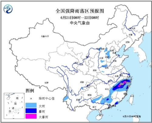 全國(guó)強(qiáng)降雨落區(qū)預(yù)報(bào)圖(6月21日08時(shí)-22日08時(shí))