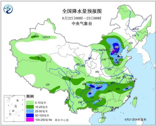 全國(guó)降水量預(yù)報(bào)圖(6月21日08時(shí)-22日08時(shí))