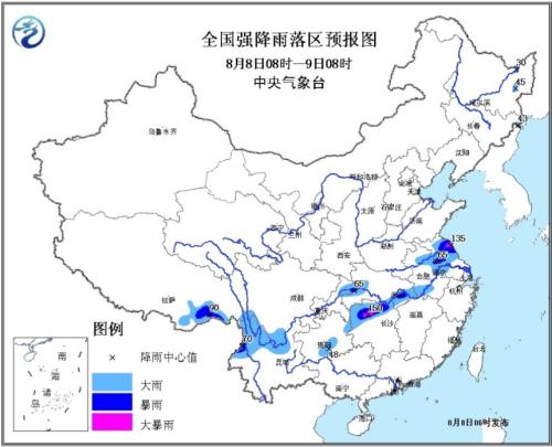 央廣網(wǎng)8月8日消息 據(jù)中央氣象臺(tái)網(wǎng)站消息,中央氣象臺(tái)8月8日06時(shí)繼續(xù)發(fā)布暴雨藍(lán)色預(yù)警:預(yù)計(jì)8月8日08時(shí)至9日08時(shí),重慶東北部、湖北西部和東南部、湖南北部、安徽東北部和西南部、江蘇中北部以及西藏東南部、云南西北部等地的部分地區(qū)有大雨或暴雨,其中湖南北部、江蘇東北部等地的局部地區(qū)有大暴雨(100~150毫米);上述地區(qū)有短時(shí)強(qiáng)降水,局地伴有雷暴大風(fēng)等強(qiáng)對流天氣,最大小時(shí)雨強(qiáng)可達(dá)50~80毫米。