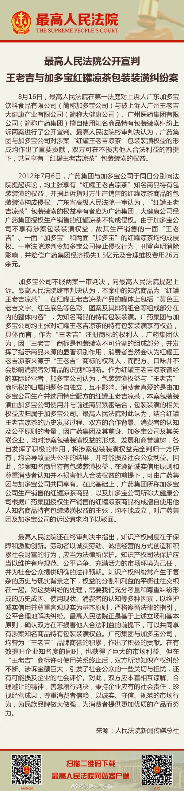 最高人民法院今天在第一法庭對(duì)上訴人廣東加多寶飲料食品有限公司(簡(jiǎn)稱(chēng)加多寶公司)與被上訴人廣州王老吉大健康產(chǎn)業(yè)有限公司(簡(jiǎn)稱(chēng)大健康公司)、廣州醫(yī)藥集團(tuán)有限公司(簡(jiǎn)稱(chēng)廣藥集團(tuán))擅自使用知名商品特有包裝裝潢糾紛上訴兩案進(jìn)行了公開(kāi)宣判。最高人民法院終審判決認(rèn)為,廣藥集團(tuán)與加多寶公司對(duì)涉案“紅罐王老吉涼茶”包裝裝潢權(quán)益的形成均作出了重要貢獻(xiàn),雙方可在不損害他人合法利益的前提下,共同享有“紅罐王老吉涼茶”包裝裝潢的權(quán)益。(新民晚報(bào) 潘子璇)