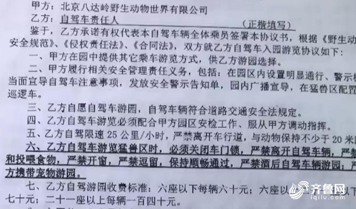 這份《自駕車入園車損責(zé)任協(xié)議書》也被網(wǎng)友戲稱為生死契,里面第4條黑體加粗的明確寫明嚴(yán)禁開窗、嚴(yán)禁喂食、嚴(yán)禁逗留,同時協(xié)議書的第十條也寫明,甲乙雙方有違上訴協(xié)議內(nèi)容,各自承擔(dān)相關(guān)責(zé)任。動物園方面表示,如果不簽署這份協(xié)議,是沒有辦法進(jìn)園游覽的。