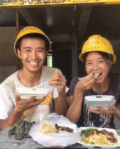 劉磊(左一)、李霞夫婦在工地吃午飯時錄制視頻, 該視頻在平臺點(diǎn)擊量達(dá)88萬,有近4000條評論。