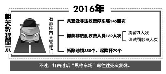 對(duì)于群眾深惡痛絕的黑停車場(chǎng),石家莊市交警部門一直沒有停止打擊。相關(guān)數(shù)據(jù)顯示,2016年,石家莊市交管部門共查處非法收費(fèi)停車場(chǎng)145起次;抓獲非法亂收費(fèi)人員169人次,其中拘留71人次、訓(xùn)誡罰款98人次;拆除地鎖358個(gè)、起降桿79個(gè)。不過,打擊過后黑停車場(chǎng)卻往往死灰復(fù)燃。