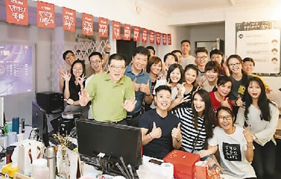 唐亮(前排左一)和李小鵬、李安琪夫妻(前排左二、左三)在辦公室與植觀員工一起迎接“雙11”。