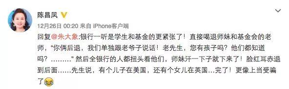 “她們問,你兒子在不在?在的話要跟兒子溝通一下。哈哈哈。我說,兒子在美國,女兒在英國,都不在這兒!