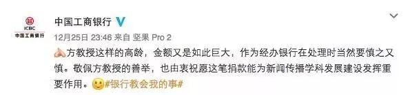 看著銀行工作人員一副“老先生肯定被騙了”的表情,陪同方教授去銀行的中國人民大學新聞學院教授王潤澤哭笑不得,在手機里翻出前一天捐贈儀式的新聞,還播放了現(xiàn)場的視頻,加上老先生再三確認,銀行工作人員才為他辦理了業(yè)務(wù)。