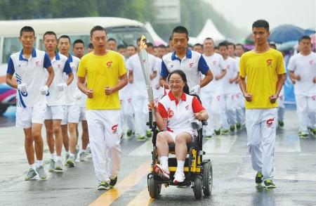 2015年9月8日,成都市雙流,第九屆殘疾人運(yùn)動(dòng)會(huì)火炬?zhèn)鬟f,圖為火炬手陳媛進(jìn)行火炬?zhèn)鬟f。 受訪者供圖