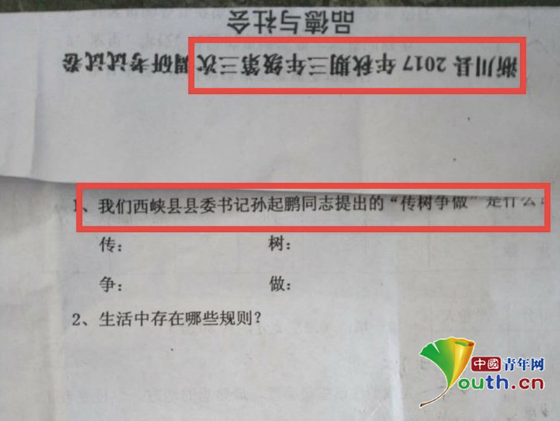 一名家長整理的試卷圖片顯示,淅川縣與西峽縣多份試卷試題大范圍雷同。一份小學三年級的《品德與社會》試卷中要求學生回答“我們西峽縣縣委書記孫起鵬同志提出的‘傳樹爭做’是什么?生活中存在哪些規(guī)則?”。除此以外,試卷中還有多道西峽特色顯著的題目。