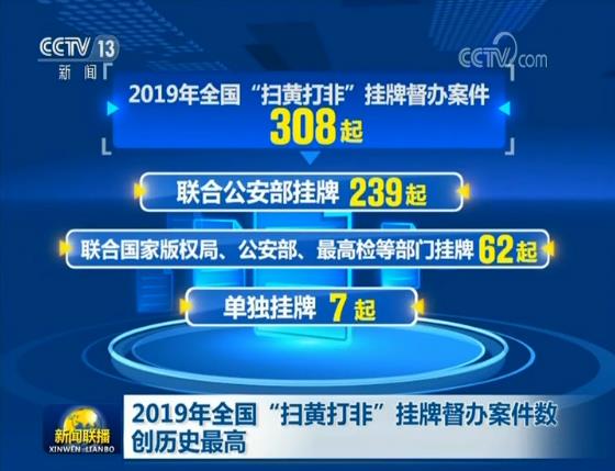 央視網(wǎng)消息(新聞聯(lián)播):全國(guó)“掃黃打非”辦公室今天(12月25日)對(duì)外通報(bào),2019年掛牌督辦“掃黃打非”案件數(shù)量創(chuàng)歷史最高,全年共掛牌督辦大案要案308起。其中,聯(lián)合公安部掛牌239起,聯(lián)合國(guó)家版權(quán)局、公安部、最高檢等部門掛牌62起,單獨(dú)掛牌7起。