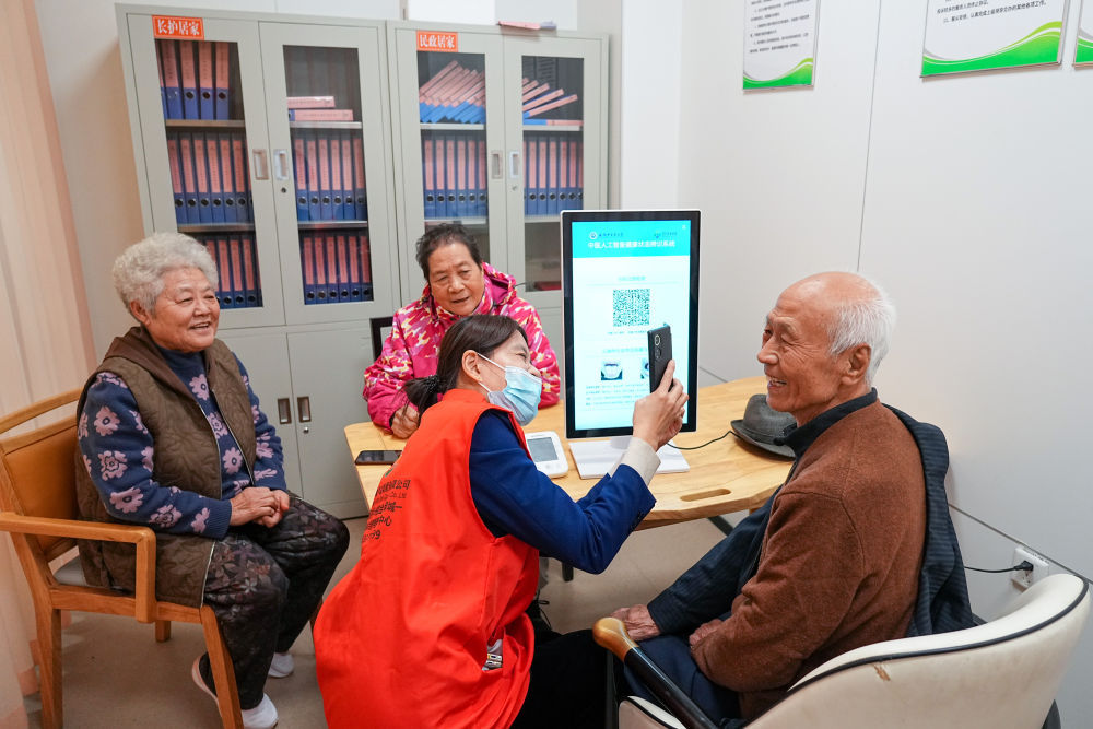 2025年10月23日,老人們?cè)谏綎|省淄博市張店區(qū)馬尚街道金石社區(qū)日間護(hù)理中心測(cè)量健康數(shù)據(jù)。新華社記者朱崢攝