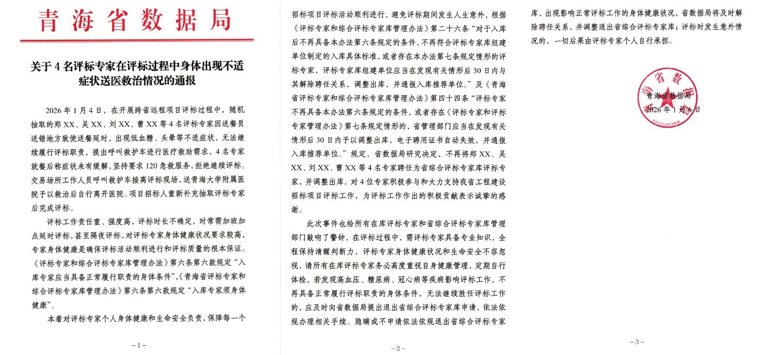 青海省數(shù)據(jù)局在青海省公共資源交易網(wǎng)發(fā)布一則《關(guān)于4名評標(biāo)專家在評標(biāo)過程中身體出現(xiàn)不適癥狀送醫(yī)救治情況的通報》引發(fā)關(guān)注。
