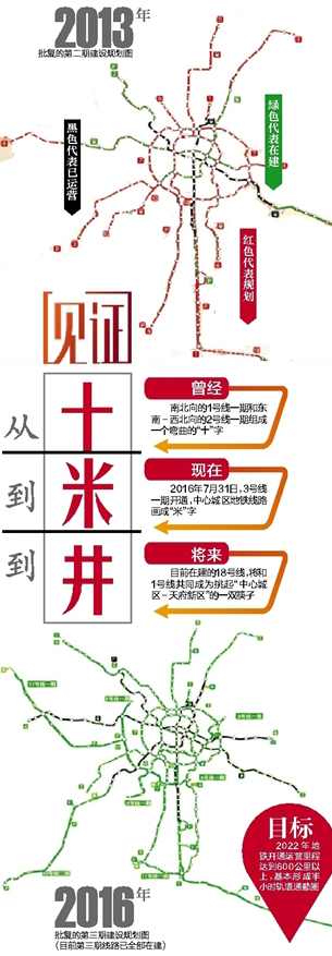 2016年7月31日,3號(hào)線一期開(kāi)通,中心城區(qū)地鐵線路畫(huà)成“米”字