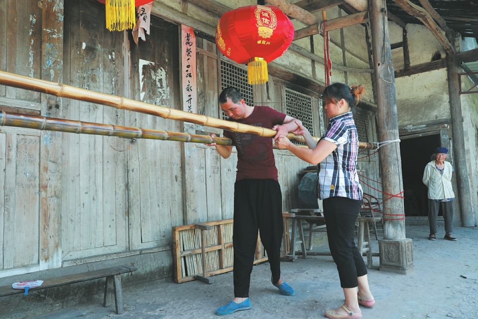 靳珍秀攙扶丈夫做身體恢復(fù)鍛煉。