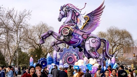 春節(jié)假期,濟南市第45屆天下第一泉迎春花燈會“馬力全開”燈組在大明湖南岸正誼廣場持續(xù)“圈粉”。