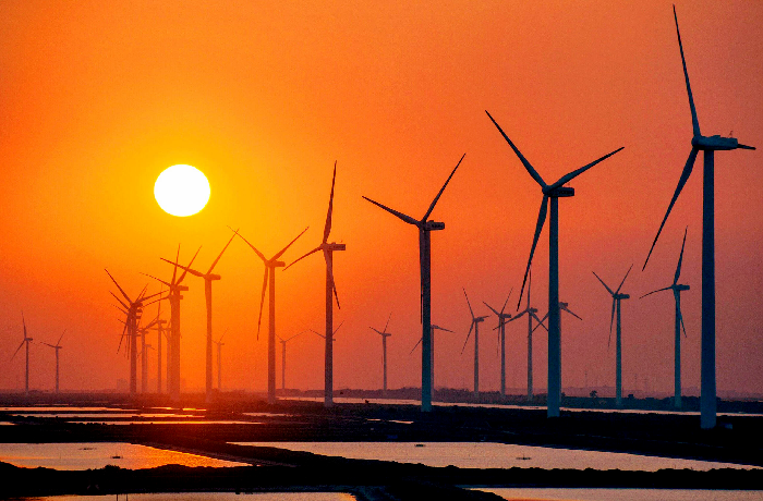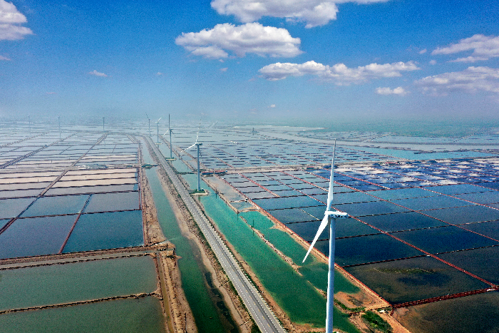 如今,濱州已形成以風電、光伏為主體,氫能、地熱、生物質能為補充的多元清潔供能體系。圖為北部沿海風電場(資料圖)