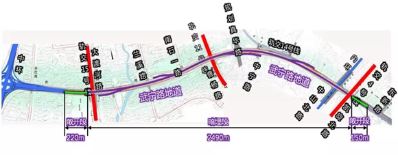 武寧路快速化改造工程實施范圍西起中環(huán)路東側(cè),向東穿越內(nèi)環(huán)線高架后至東新路止,全長3.5千米,其中地道主線2.86千米,采用“地道雙向4車道(道路等級為城市快速路,設(shè)計車速60千米/小時)+地面雙向6車道(道路等級為城市主干路,設(shè)計車速50千米/小時)”。