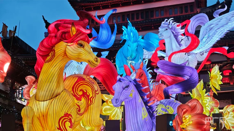 在豫園的中心廣場,以“盛唐六駿”為靈感、高達(dá)三層的主燈組“駿馳九州”準(zhǔn)時(shí)點(diǎn)亮。萬千朵璀璨之花自馬蹄下次第綻放,引得市民游客陣陣驚嘆。作為《山海奇豫記》的第四季,今年的非遺燈彩與數(shù)字科技深度融合,不僅能看到傳統(tǒng)榫卯工藝與光影技術(shù)結(jié)合的巨型走馬燈,還能在九曲橋畔欣賞到“二十八星宿”與《山海經(jīng)》神獸構(gòu)成的星河畫卷。