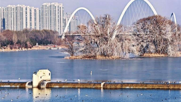 山西太原汾河景區(qū)水鳥嬉戲覓食