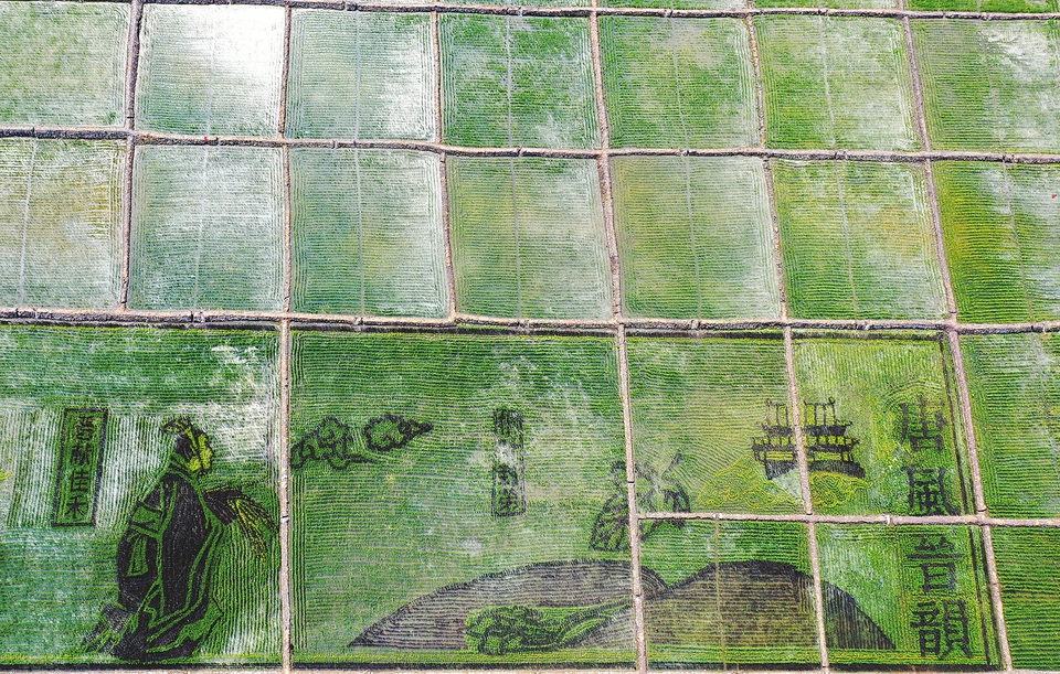7月5日,太原市晉源區(qū)花塔村稻田公園,空中俯瞰碧綠的稻田內(nèi)呈現(xiàn)出獨(dú)特的“畫(huà)作”。這些稻田畫(huà)是山西農(nóng)大有關(guān)專(zhuān)家運(yùn)用農(nóng)業(yè)科技培育出彩色秧苗,在稻田內(nèi)按設(shè)計(jì)圖案播種形成,今年的稻田畫(huà)主題為“唐風(fēng)晉韻”,用稻田作“畫(huà)布”,秧苗作“顏料”,繪就一幅展現(xiàn)古代并州人文風(fēng)貌的獨(dú)特畫(huà)卷。(記者李兆民 攝)