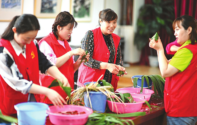 6月3日,志愿者和居民們正在開心地一邊包粽子一邊嘮家常。當日,太原市迎澤街道青年路一社區(qū)志愿者提早備好原料,邀請社區(qū)困難家庭居民,歡聚一堂包粽子,共話美好生活。(記者李兆民攝)