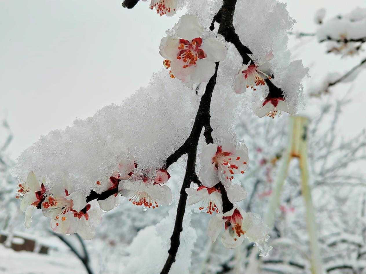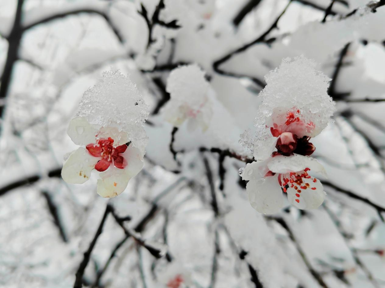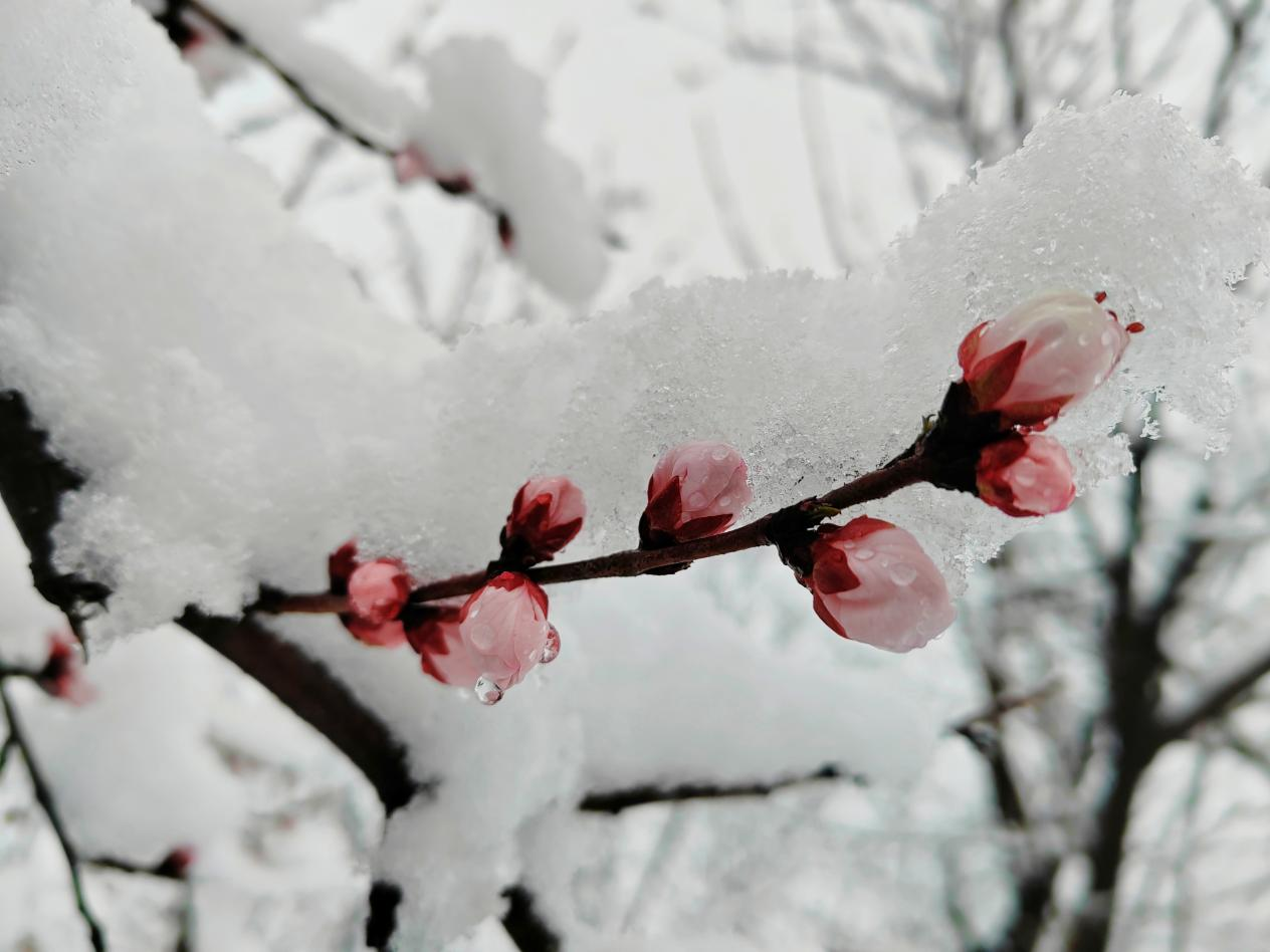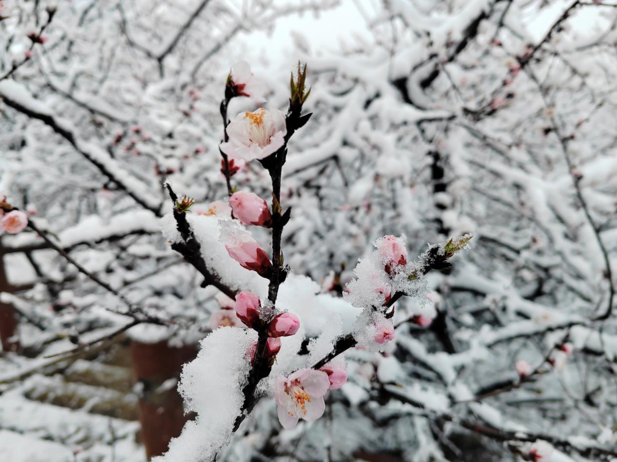 銀裝素裹之下,嶺回千畝桃林化身冰雪桃源;層層梯田里,灼灼桃花頂著晶瑩雪團(tuán),粉白交織、冷暖相映;山間村落、林間步道被薄雪輕覆,遠(yuǎn)山含黛、近花凝雪,一步一景皆入畫。不少游客與攝影愛好者冒雪前來,定格“雪落桃花開”的限定美景。