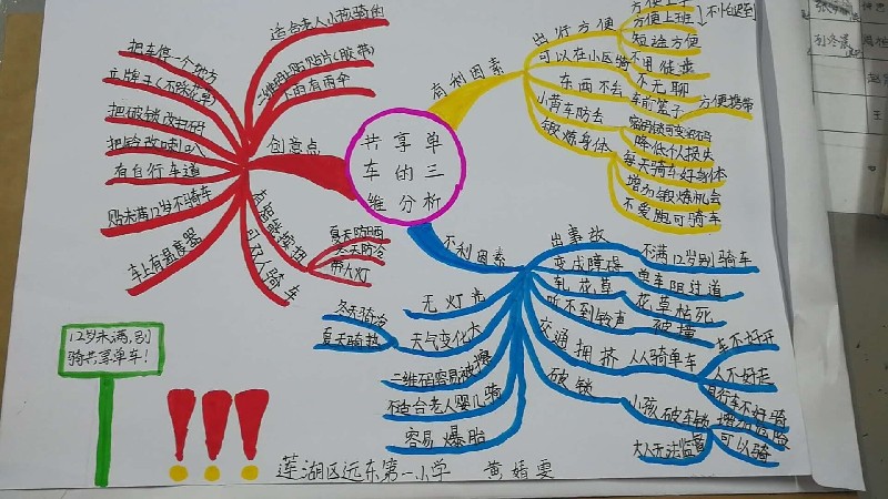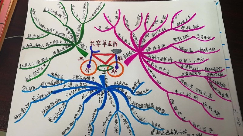 設(shè)計可折疊的共享單車,不使用時折疊起來擺放,節(jié)省城市空間;單車配備人臉識別功能,自動識別未成年人,只有成年人才可以“刷臉”開鎖;在城市道路上增加更多的自行車道,防止單車與行人、汽車混行;共享單車軟件與個人征信系統(tǒng)相連,成年人使用不需要交押金就可使用,也可避免未成年人使用;為了增加夜間騎車的安全性,可以在單車上裝上反光標(biāo)貼和自動發(fā)電的車燈……同學(xué)們用思維導(dǎo)圖描述出他們五花八門的創(chuàng)意想法。班主任萬老師評價:“在我看來,孩子們的一些想法并不比大人差,還具有很強的的操作性,能夠看出他們在平日中對社會現(xiàn)象的觀察和思考。我們也希望孩子能通過此次話題探討,能夠提高他們對城市交通安全的認(rèn)識、參與社會話題的熱情以及獨立思考的能力!