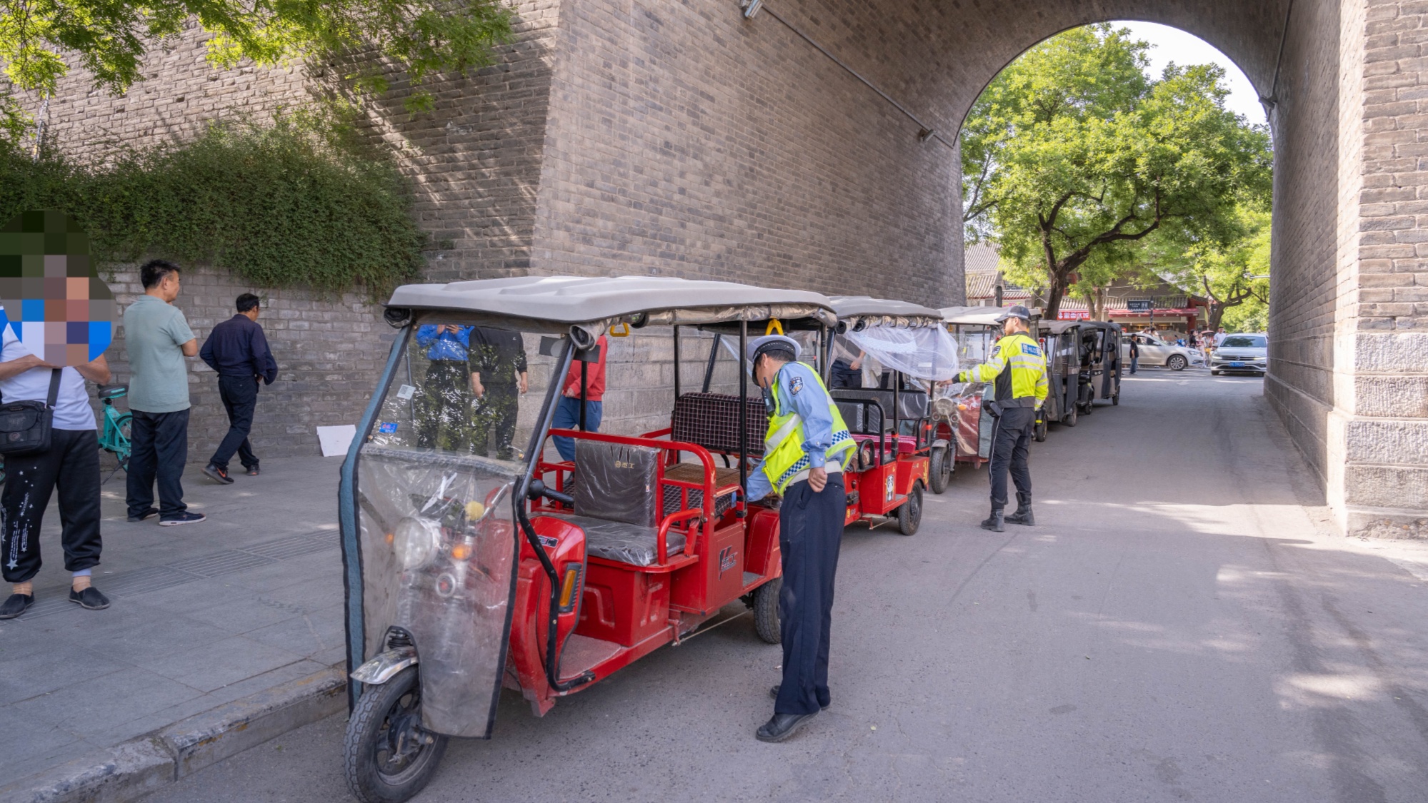 4月29日下午3點,西安市公安交警在長樂門城墻下開展了針對兩三輪車無牌無證、闖燈逆行、非法載客等重點交通違法行為的專項整治行動。