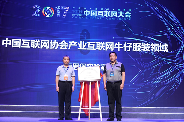 中國互聯(lián)網(wǎng)協(xié)會秘書長盧衛(wèi)與山東海思堡服裝服飾集團股份有限公司董事長馬學(xué)強為“產(chǎn)業(yè)互聯(lián)網(wǎng)牛仔服裝領(lǐng)域海思堡實驗室”揭牌