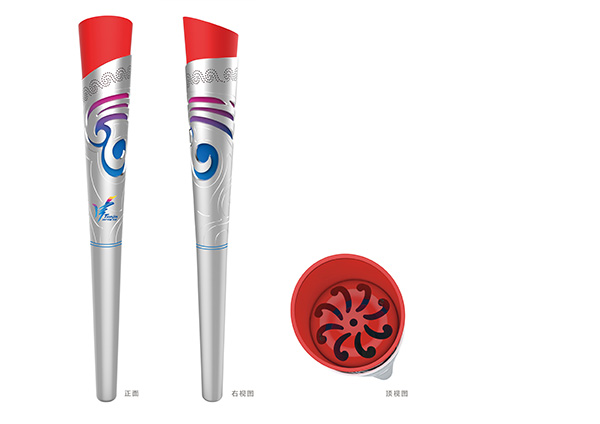 本屆全運(yùn)會火炬在設(shè)計上則充分考慮到將諸多元素融合一體,給人以美觀、莊重、大氣的感受。視覺元素為體現(xiàn)主辦地天津地域特征的海河浪花與亮麗的彩云圖案,奔騰的浪花不僅代表了運(yùn)動員拼搏奮進(jìn)的體育精神,也預(yù)示著天津這座歷史名城巨大的發(fā)展力量,而彩云圖案又象征著吉祥與和諧,為典型的中國傳統(tǒng)紋樣,傳遞出中國的概念,既預(yù)示出本屆運(yùn)動會開成一屆鼓勁、和諧、精彩的體育盛會,也預(yù)示著本屆全運(yùn)會將取得圓滿成功。火炬制作采用銀色的金屬材質(zhì),處理成亞光效果,莊重典雅,雙層結(jié)構(gòu)層次豐富,鏤空的制作彰顯出工藝的精美,而豐富的漸變色彩又賦予了豐富的聯(lián)想空間。