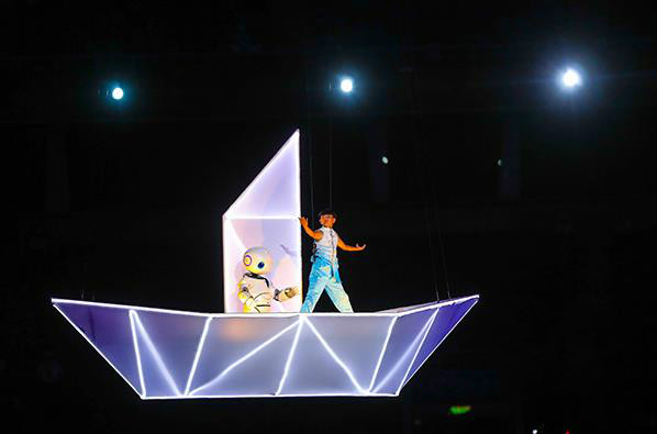 文體展演臨近結(jié)束時,主題歌《健康贏未來》激情唱響,觀眾席上出現(xiàn)“喜迎十九大,共赴新征程”的標(biāo)語,中國紅的大紅燈籠隨著音樂的優(yōu)美旋律震撼升起,全場歡騰。此外,在節(jié)目呈現(xiàn)上努力創(chuàng)新,在大型體育賽事開幕式上實(shí)現(xiàn)了視頻3D技術(shù)和節(jié)目內(nèi)容的完美融合。