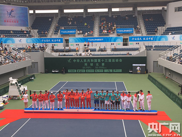 6月18日,第十三屆全運會網球團體賽決賽在天津網球中心舉行。江蘇隊奪得男子組冠軍,天津隊奪得女子組冠軍。男子組最后決勝隊伍江蘇隊與浙江隊實力相近,最后以江蘇隊雙打配合優(yōu)勢險勝浙江隊。而女子組團體賽天津隊以兩名實力戰(zhàn)將張帥、彭帥,兩場單打以明顯優(yōu)勢奪得冠軍。