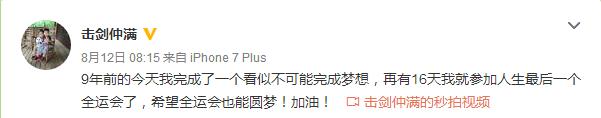 8月12日,仲滿在個人微博上寫道:“9年前的今天我完成了一個看似不可能完成夢想,再有16天我就參加人生最后一個全運會了,希望全運會也能圓夢!加油!”時隔四年重回賽場,仲滿為的就是那枚始終未得的全運個人金牌。