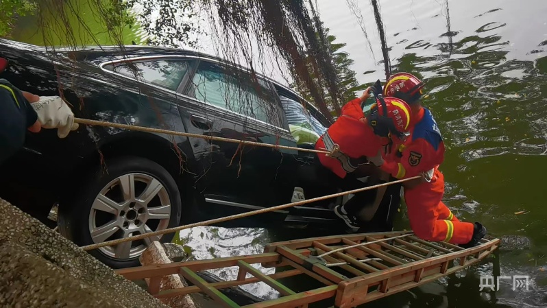 廣東江門(mén)一小車(chē)沖破護(hù)欄懸掛湖邊
