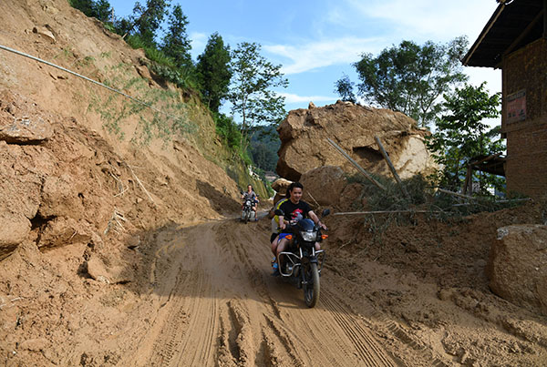 7月12日,在廣西融水苗族自治縣香粉鄉(xiāng)雨卜村卜令屯,村民騎摩托車(chē)從塌方路段經(jīng)過(guò)。